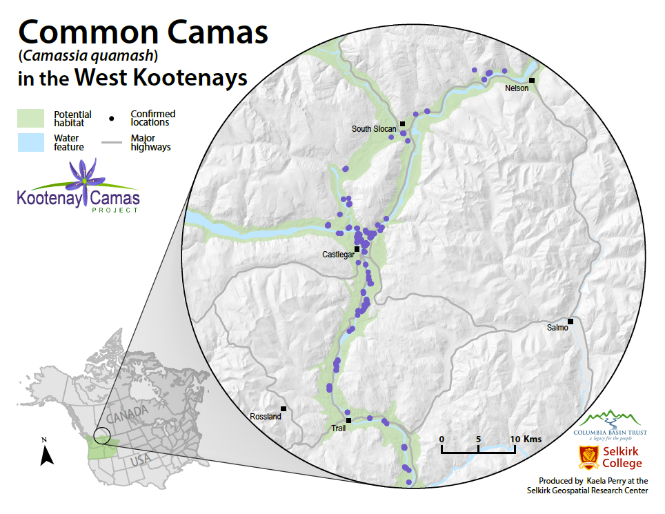 Camas is an important natural and cultural resource in the West Kootenay. Camas was an important part of First Nations’ cultures who gathered, ate and traded it extensively. In addition, camas is a low-elevation species associated with moist and seasonally wet ecosystems.  The extent of these ecosystems has been dramatically reduced due to agricultural conversion, urban encroachment, and flood control from the dams along the Columbia River. A comprehensive inventory will provide baseline information vital to understanding the origin, persistence and threats to camas.  We will be continuing the habitat assessment we started in 2012 of known and reported camas populations and collecting herbarium specimens so that Kootenay Camas can be adequately represented in the flora of BC.